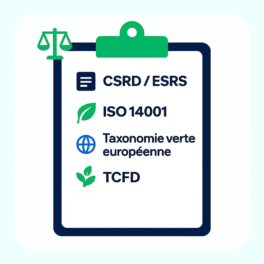 Les principaux cadres de référence sont la CSRD / ESRS, la norme ISO 14001, la Taxonomie verte européenne et les recommandations TCFD. Ensemble, ils fournissent une base solide pour structurer le reporting, assurer la transparence et piloter la performance environnementale.